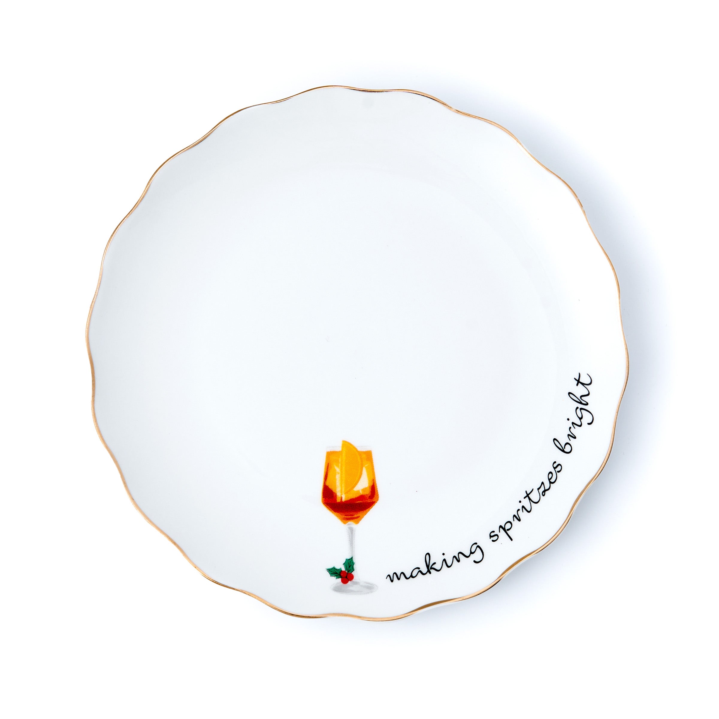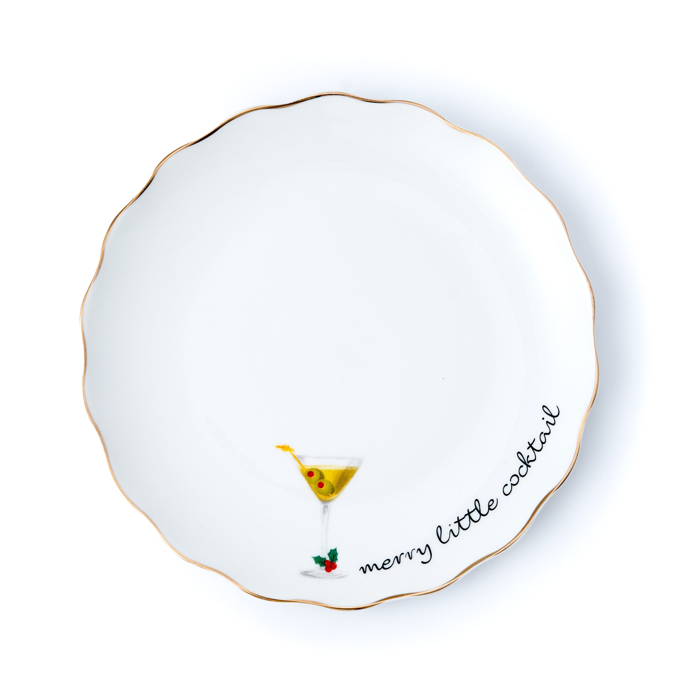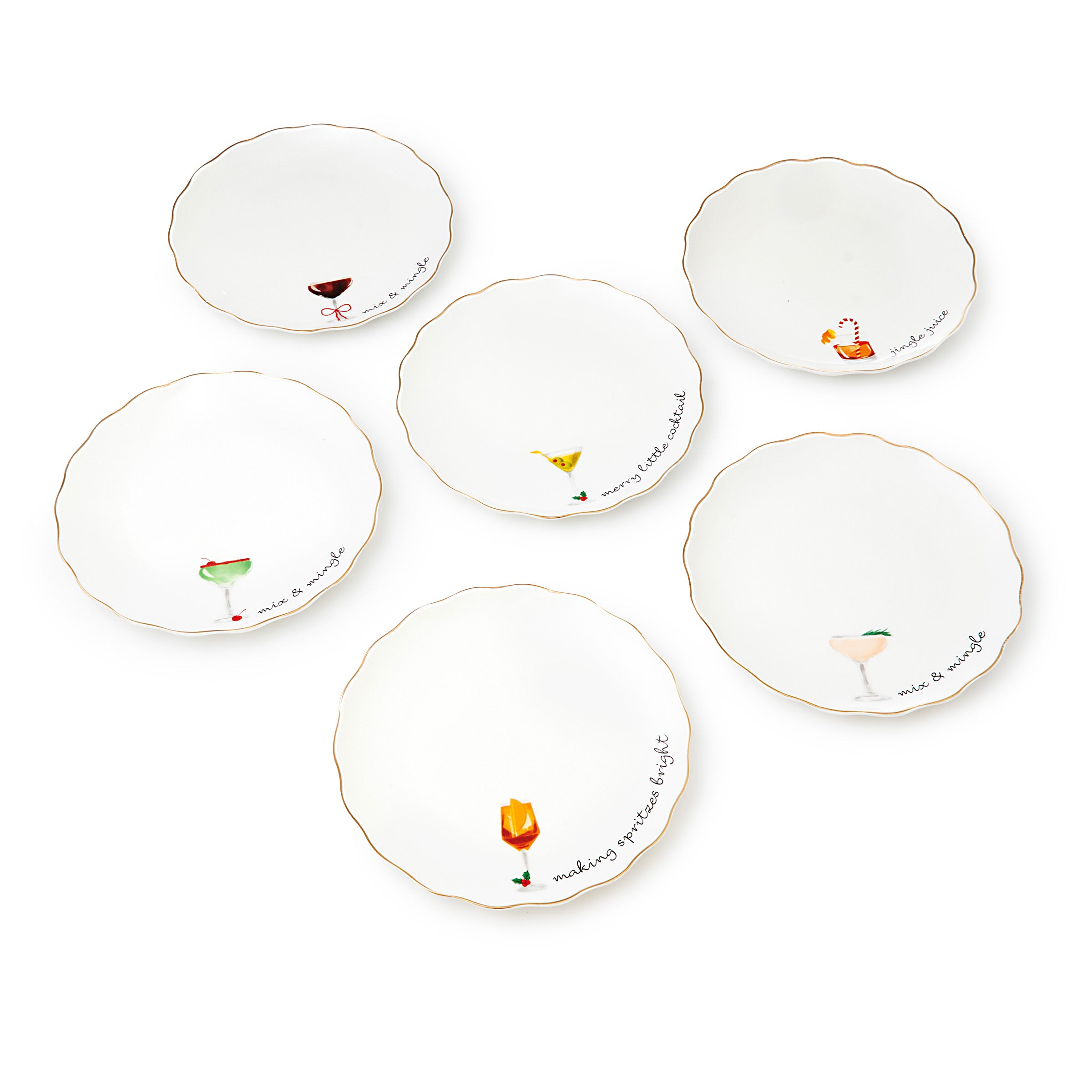 Bring festive spirit to every gathering with the Holiday Cheers Appetizer Plate Set. Crafted from fine porcelain and accented with a shimmering gold rim, each plate showcases playful holiday cocktail designs and cheerful sayings. Perfectly sized for hors d’oeuvres, desserts, or small bites, this set of six adds elegance and joy to your holiday entertaining. Pair with the matching coasters and serving platter for a coordinated seasonal table.