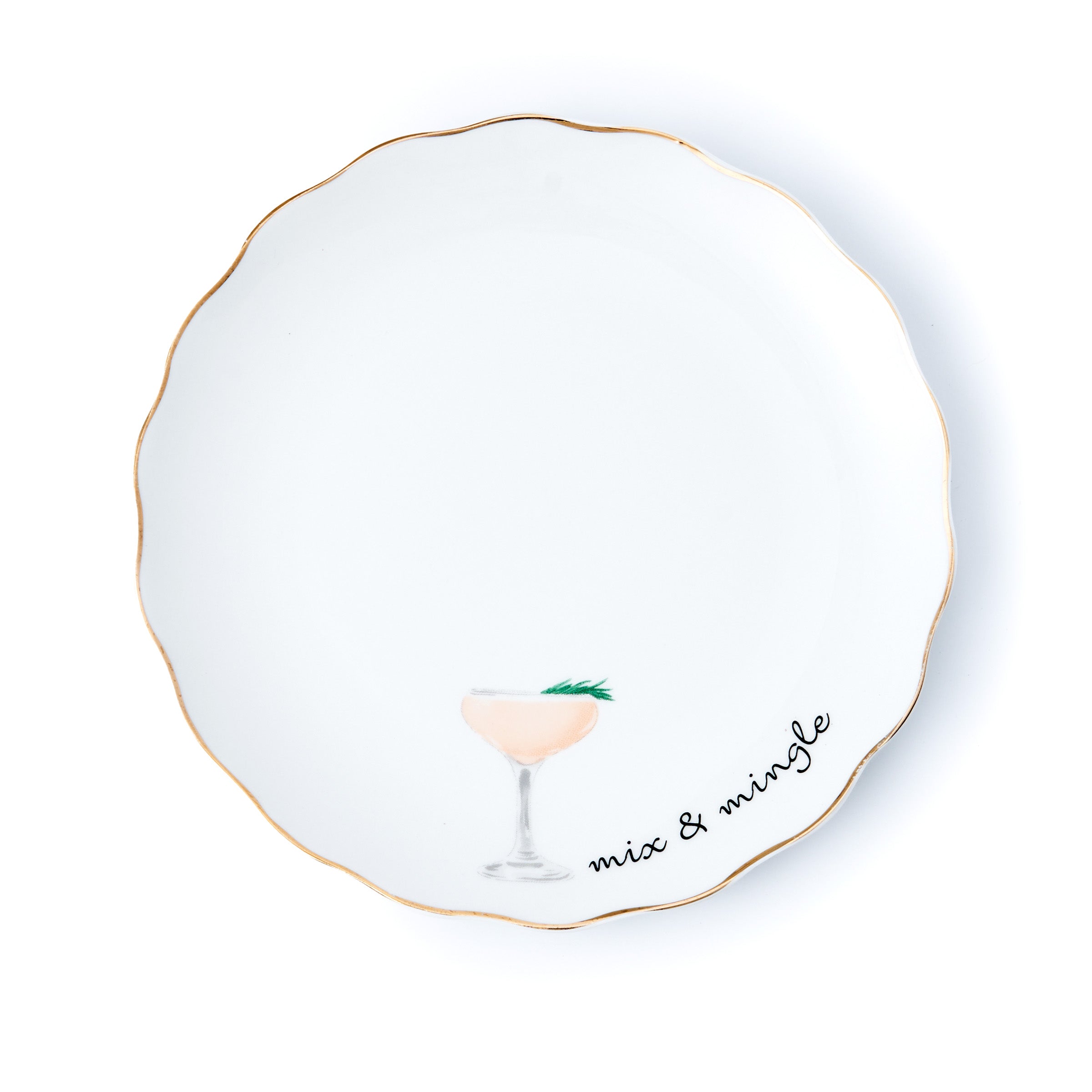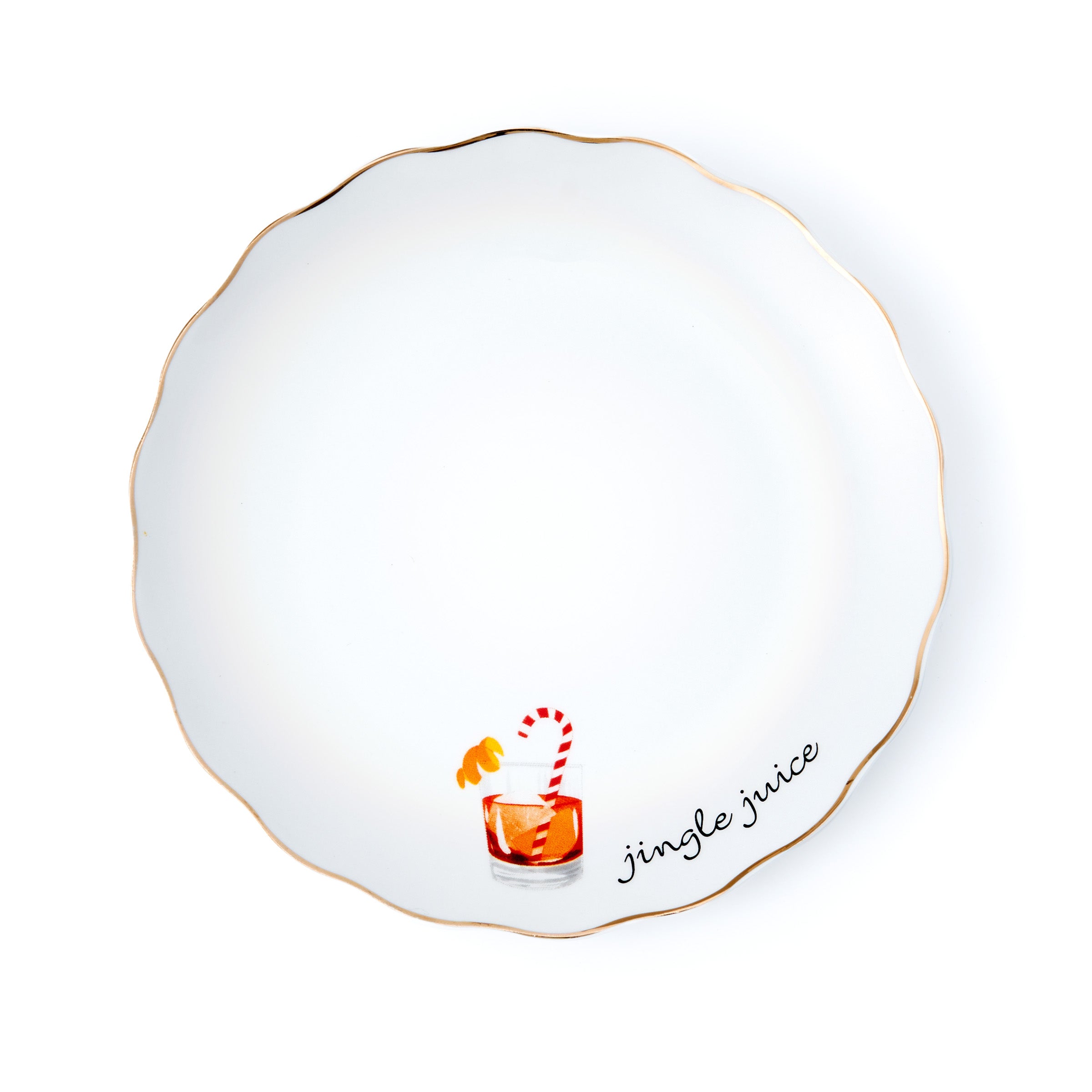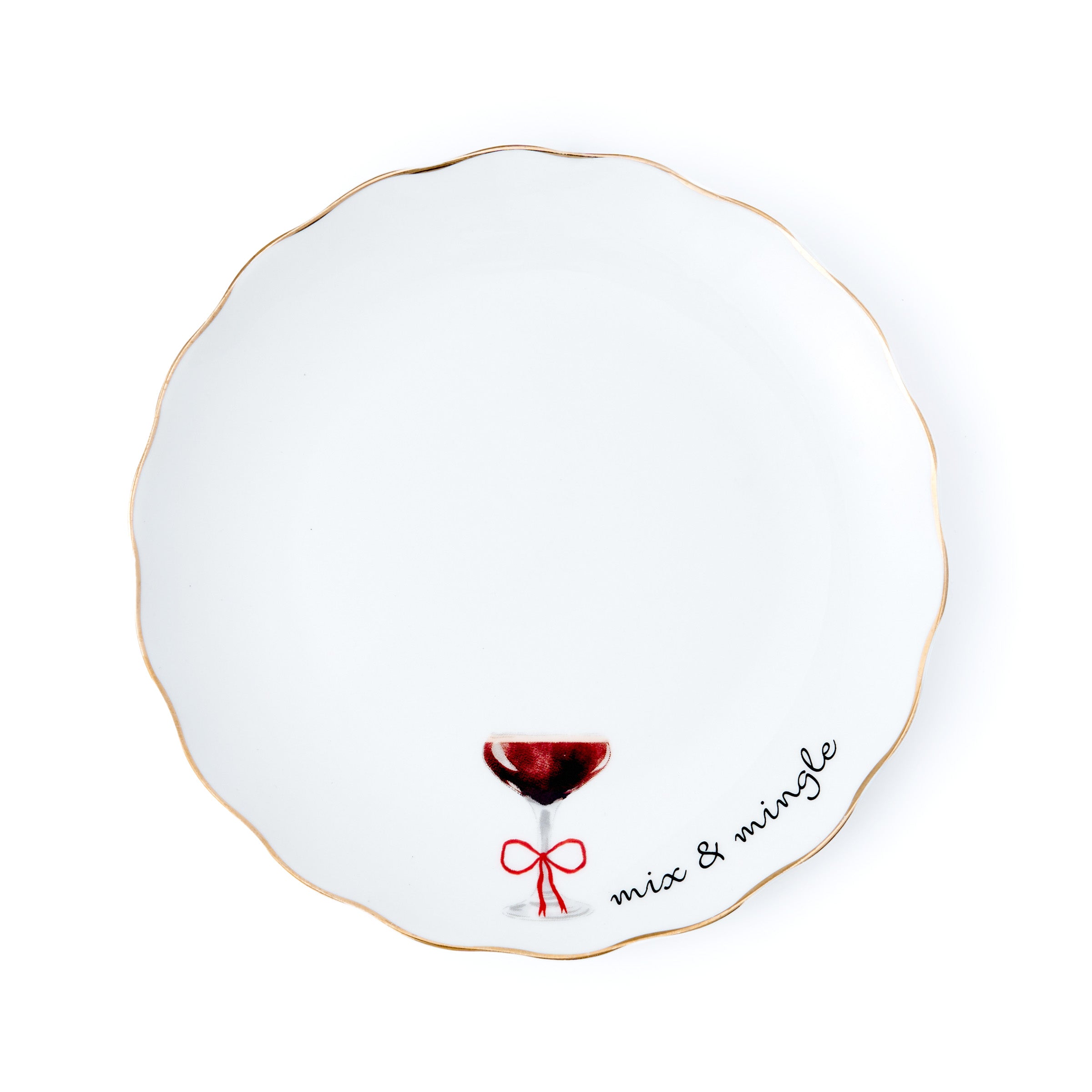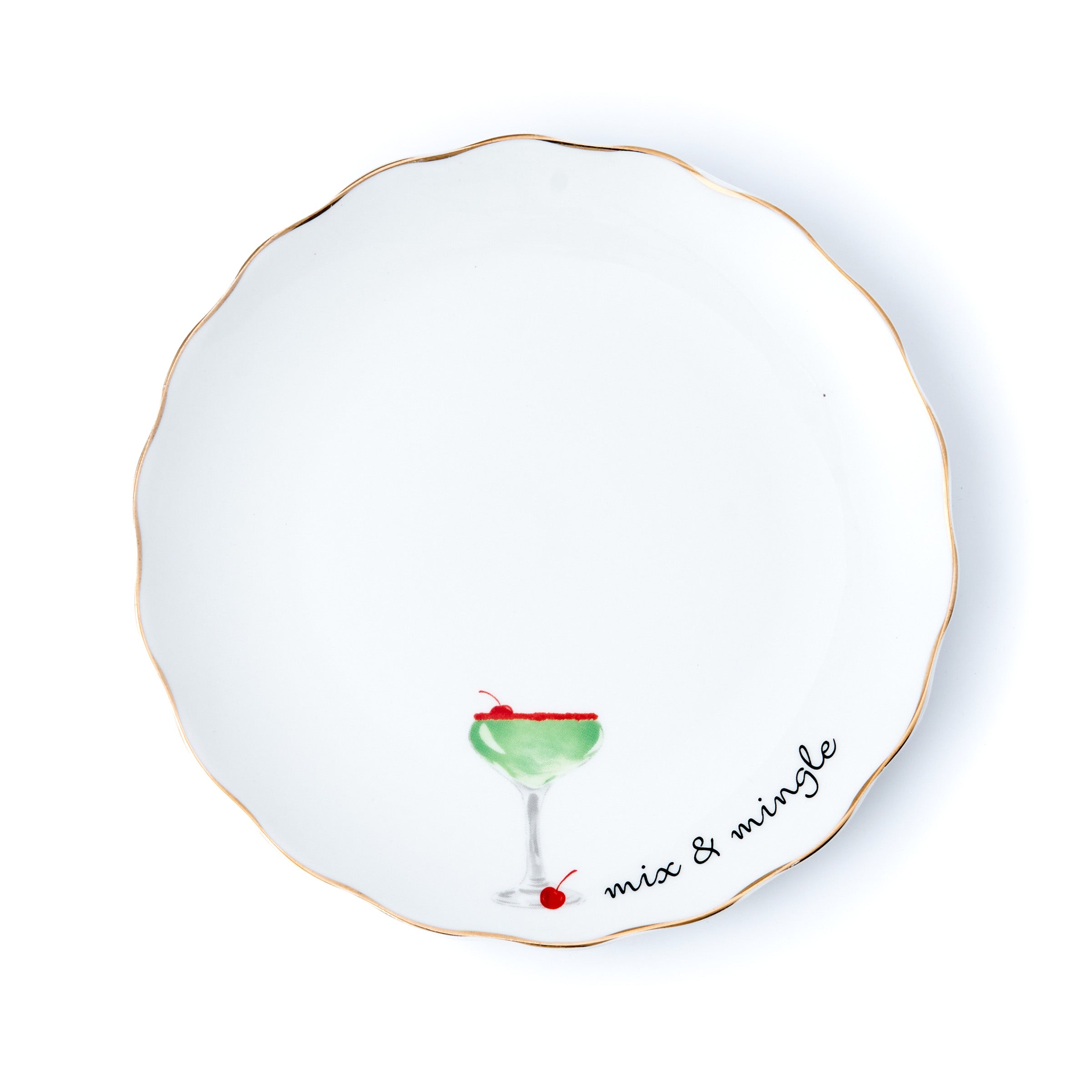 Bring festive spirit to every gathering with the Holiday Cheers Appetizer Plate Set. Crafted from fine porcelain and accented with a shimmering gold rim, each plate showcases playful holiday cocktail designs and cheerful sayings. Perfectly sized for hors d’oeuvres, desserts, or small bites, this set of six adds elegance and joy to your holiday entertaining. Pair with the matching coasters and serving platter for a coordinated seasonal table.