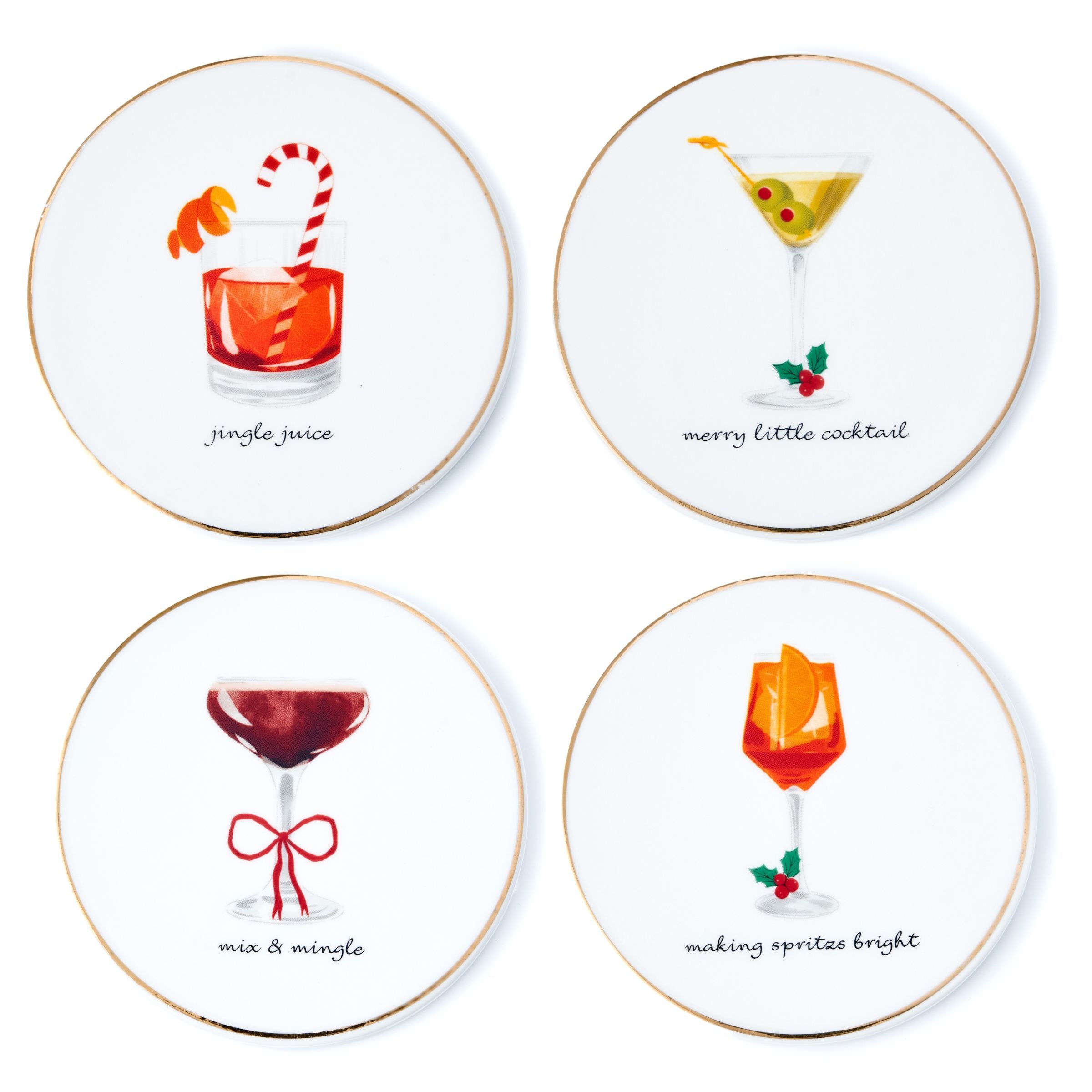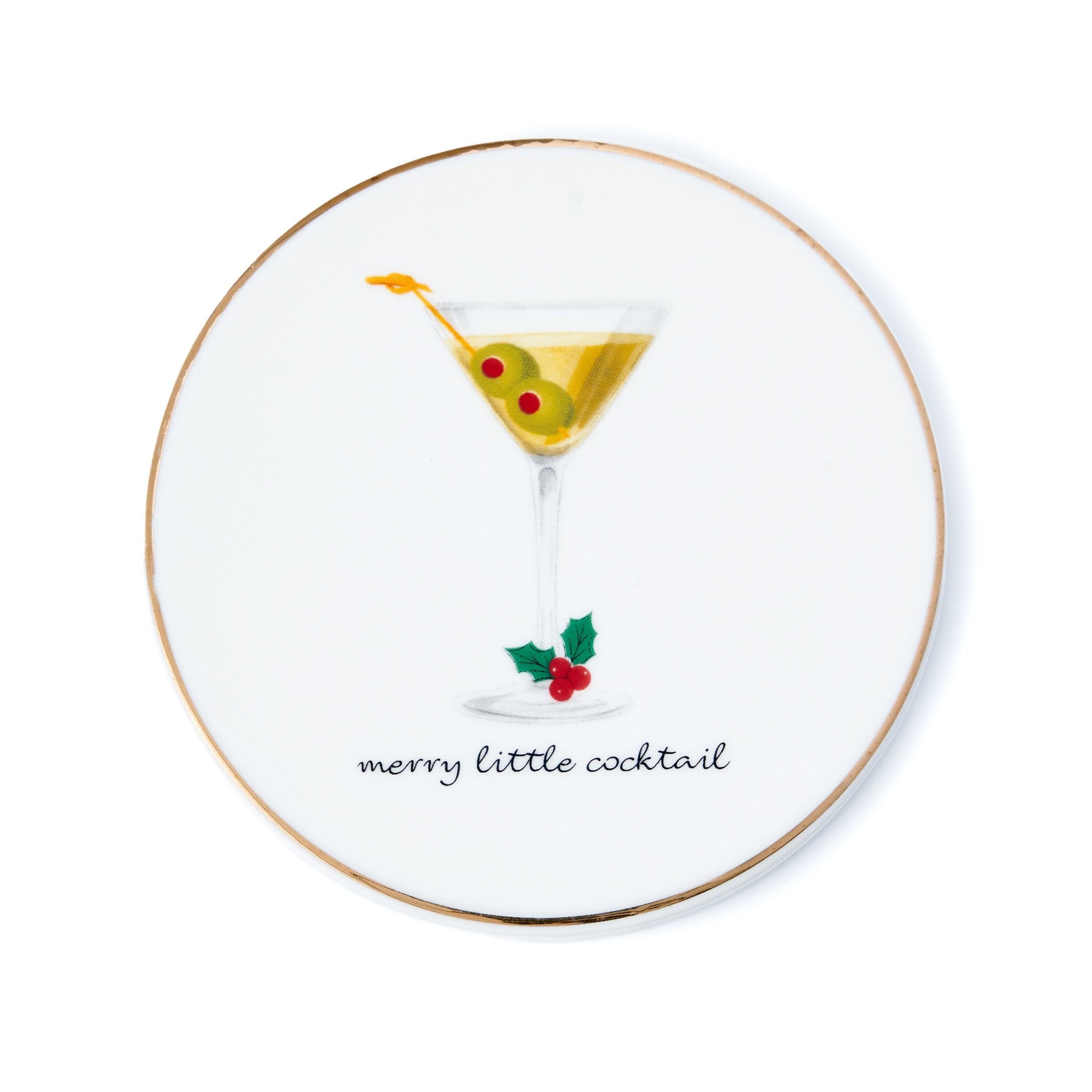 Raise a glass to festive style with the Holiday Cheers Gold Rim Coaster Set. Crafted from fine porcelain and accented with a radiant gold rim, each coaster features charming holiday cocktail illustrations and playful seasonal sayings. Perfect for protecting your tabletops in style, this set pairs beautifully with the coordinating appetizer plates and serving platter for a complete holiday entertaining look. A must-have for parties, gift-giving, or simply adding a cheerful touch to your home this season.