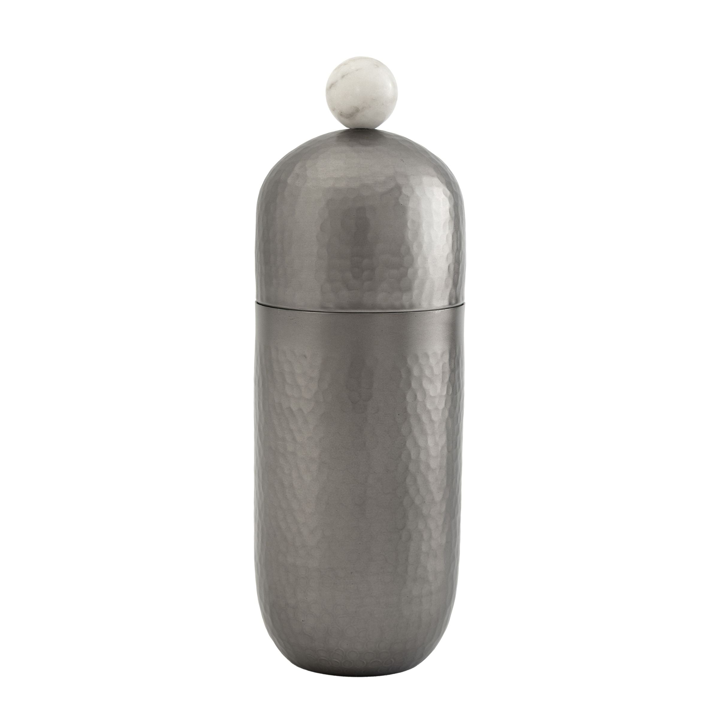 Shake up your entertaining with the Temari Hammered Gunmetal Cocktail Shaker. Handmade in India, this refined piece is crafted from stainless steel with a hammered gunmetal finish that adds depth, texture, and modern allure. Topped with a smooth white resin ball accent, it blends artisanal craftsmanship with sleek contemporary design for a bar accessory that feels both timeless and bold. Perfect for mixing cocktails with style, this shaker elevates every pour and ensures your bar setup is as memorable as the drinks you serve.