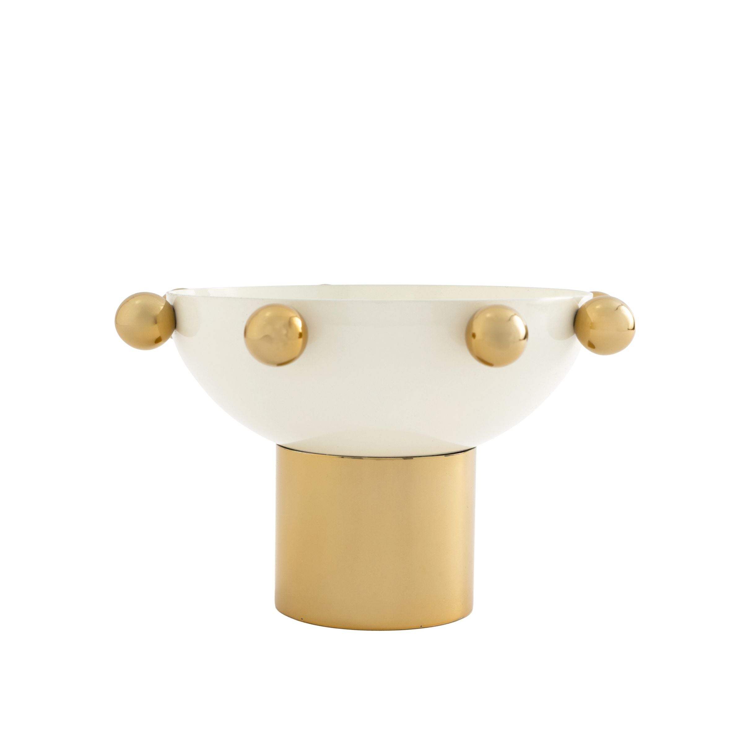 Add a modern touch of elegance to your table with the Temari White & Gold Footed Nut Bowl. Handmade in India, this bowl is crafted from polished stainless steel with a sleek white surface and clean, contemporary lines. Elevated by the collection’s signature gold ball feet, it blends modern design with timeless artistry. Perfect for serving nuts, candies, or small snacks, it also doubles as a refined decorative accent. Versatile and sophisticated, this piece makes everyday entertaining feel special.