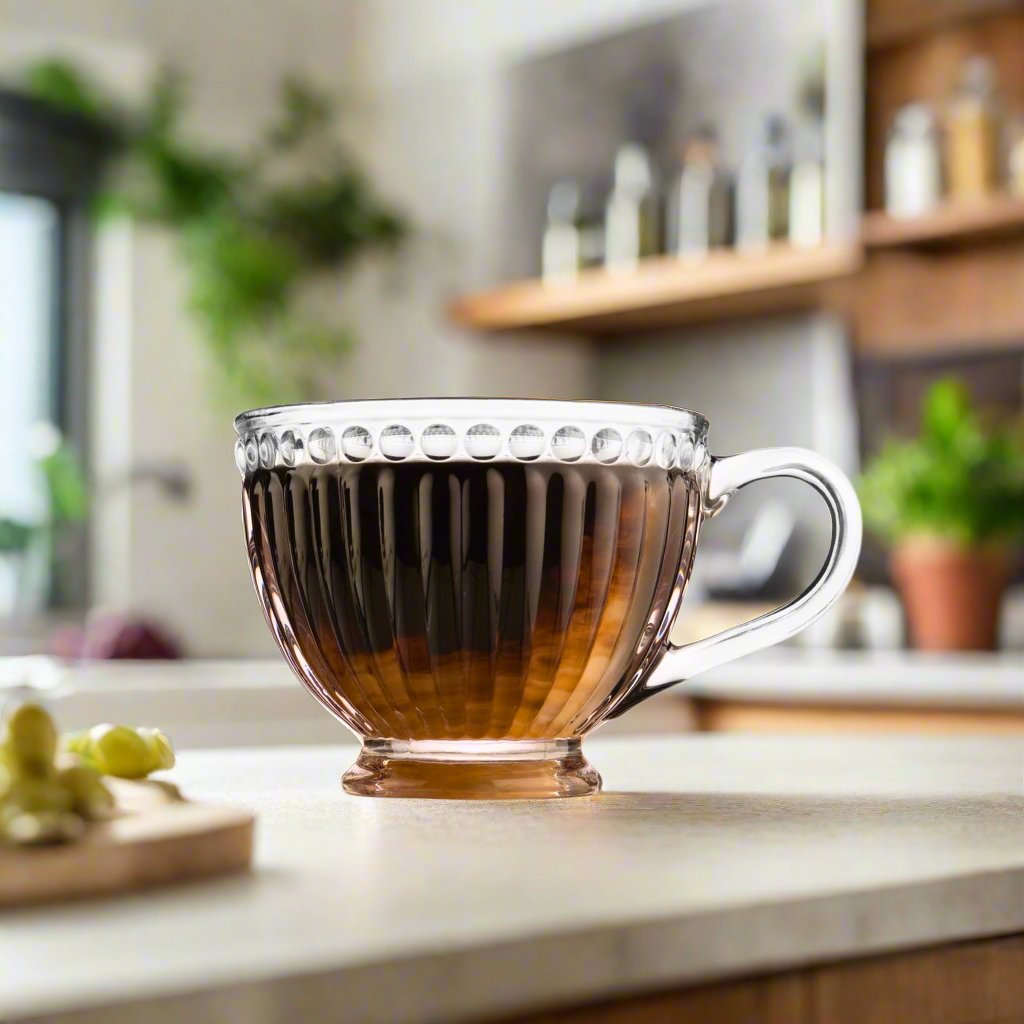 Elevate your coffee experience with the Cosmic Oversized Coffee Mug Set. Crafted from crystal-clear material and featuring a vivid, eye-catching design, each mug is sure to delight even the most discerning coffee enthusiasts. The embossed pattern with beaded detailing around the top and a raised horizontal line along the bottom adds texture and elegance, making these mugs as visually stunning as they are functional. Perfect for daily enjoyment or casual entertaining.