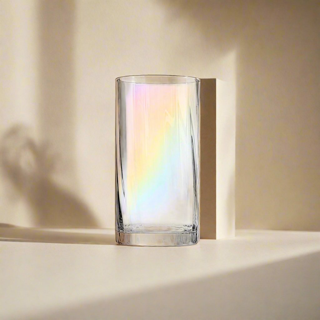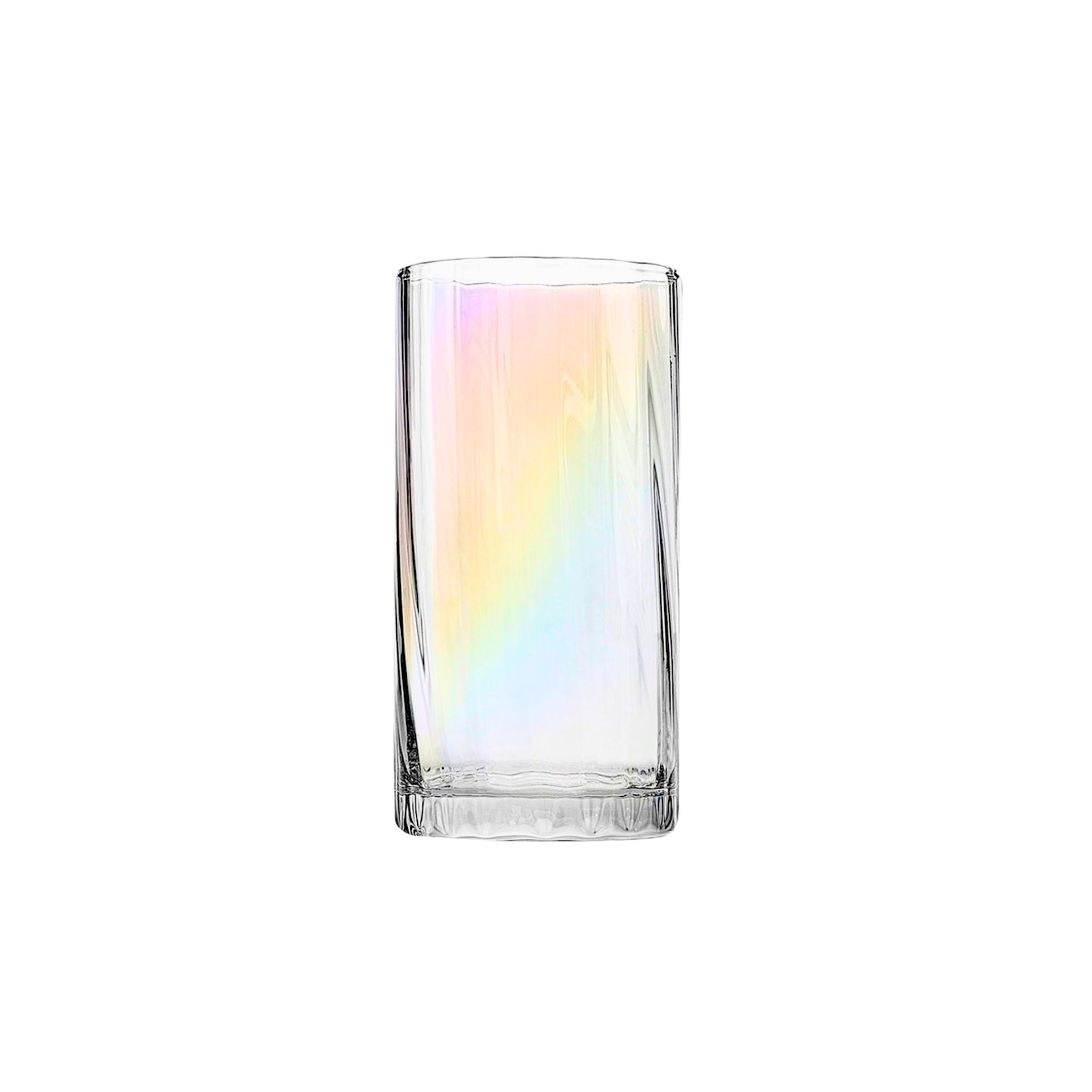 The collection features beautiful mouth-blown glassware with decorative iridescent colors for a modern look.